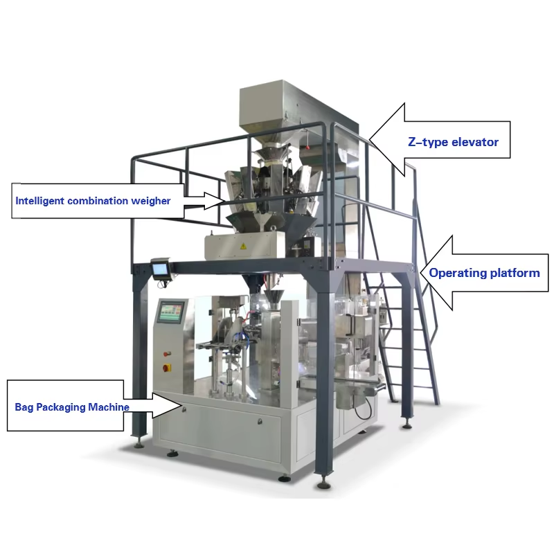 The system automatically completes material feeding, weighing, bag opening, filling, sealing, date printing, and final output. Granules are transported by a Z-type conveyor to a multi-head weigher for accurate dosing, then filled into pre-made bags and sealed by the packaging machine to achieve efficient and stable automatic packaging.