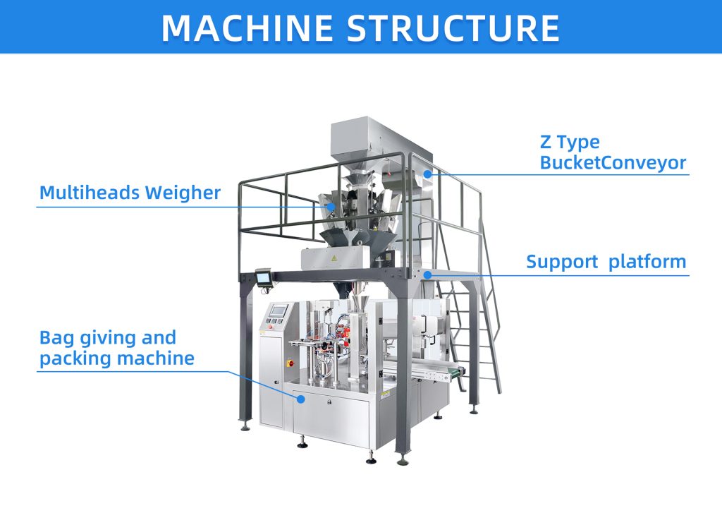 8.System includes multi-head weigher, support platform, Z-bucket elevator, and conveyor.