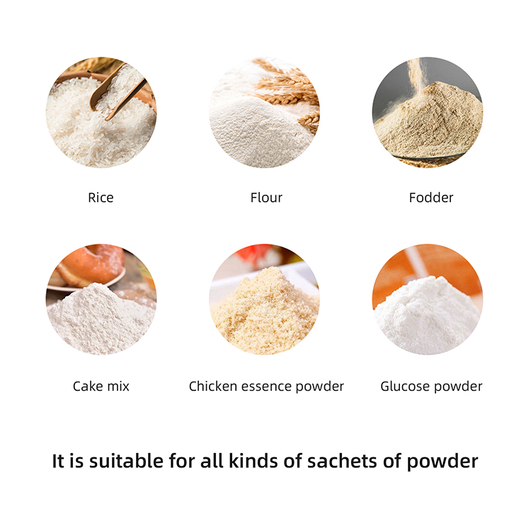 Suitable for weighing and packaging powder materials such as milk powder, coffee powder, salt powder, sugar powder, rice/wheat/corn/bean flour, washing powder, chemical powder, medical powder, feed additive powder, and other powder products.