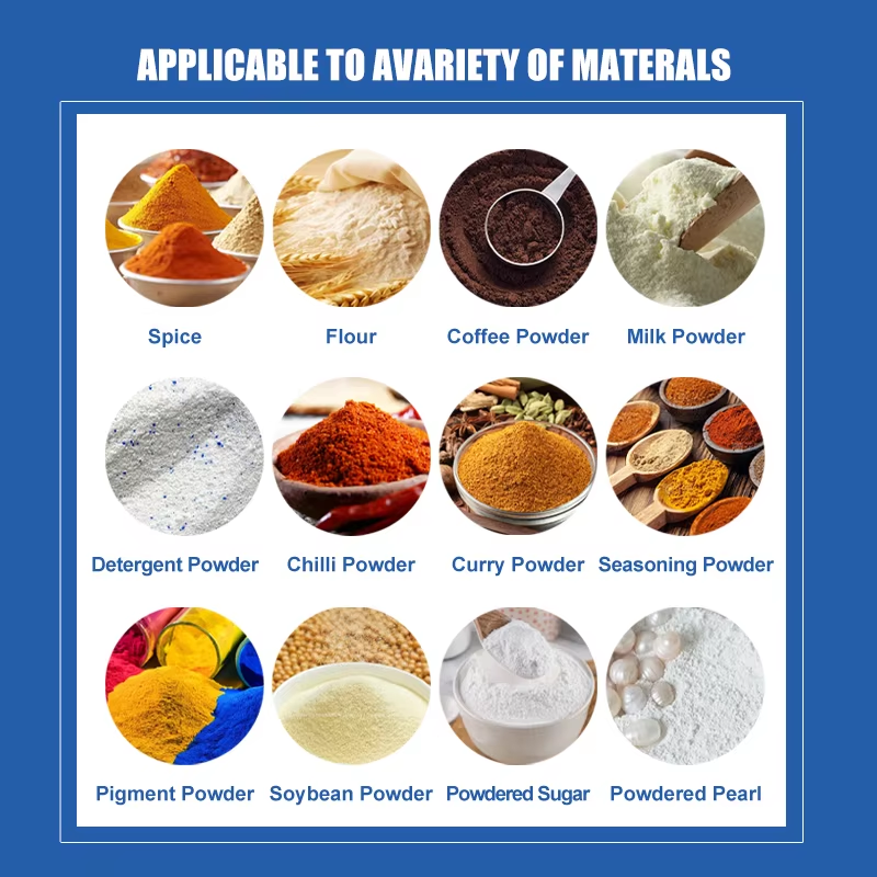 Suitable for weighing and packaging powder materials such as milk powder, coffee powder, salt, sugar, rice/wheat/corn/bean flour, detergent powder, chemical powder, medical powder, and feed additives.