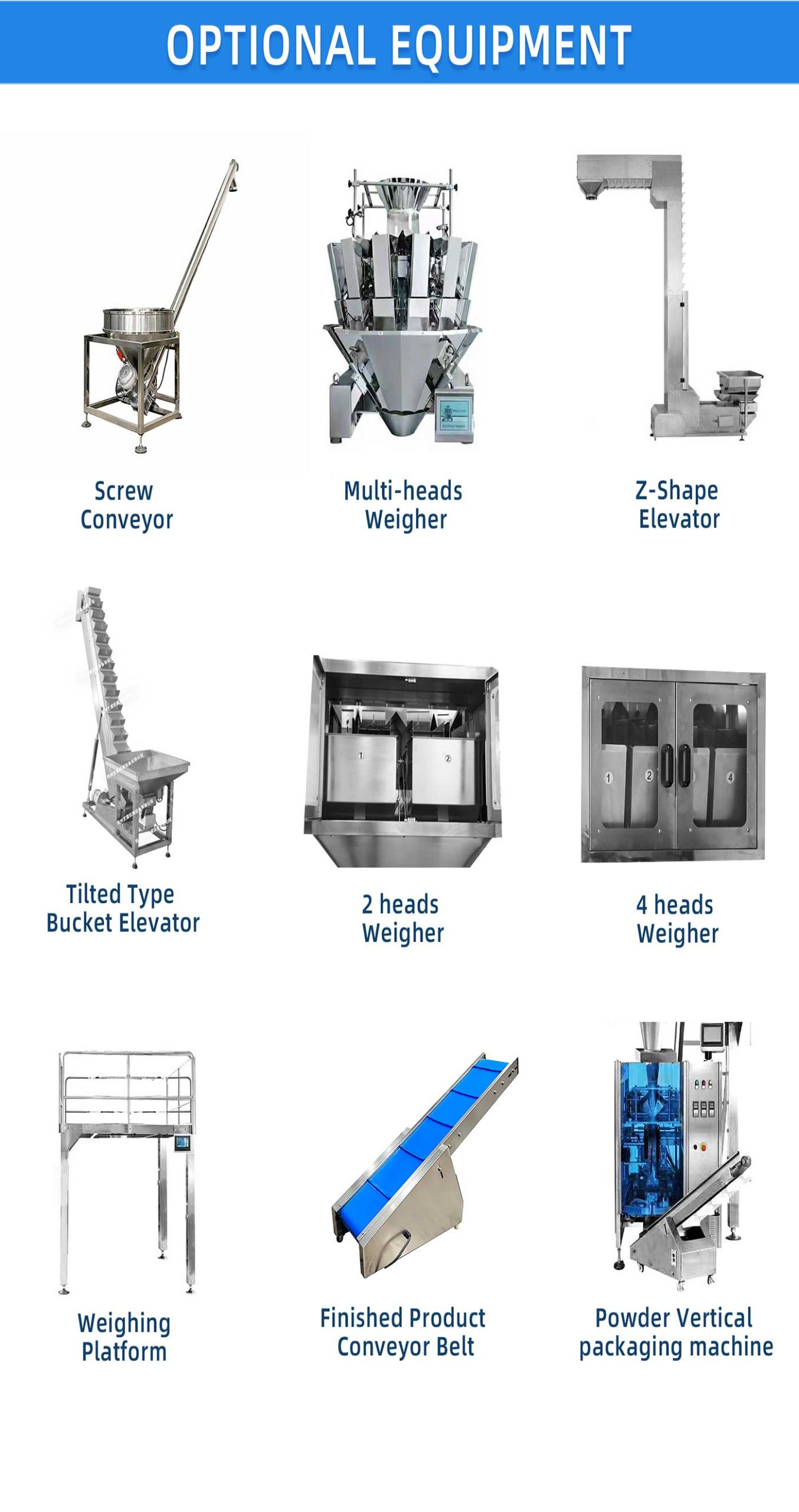 The packaging system includes a powder vertical quantitative packaging machine, a multi-head combination weigher, support platform, conveyor belt, and screw elevator. It is highly customizable to fit your business's specific needs, such as adding additional filling stations or integrating with other equipment for a fully automated packaging line.