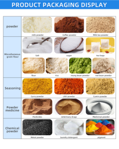 This machine is suitable for weighing and packaging various powder materials, including milk powder, coffee powder, salt powder, sugar powder, rice/wheat/corn/bean flour powder, washing powder, chemical powder, medical powder, feed additives powder, and more.