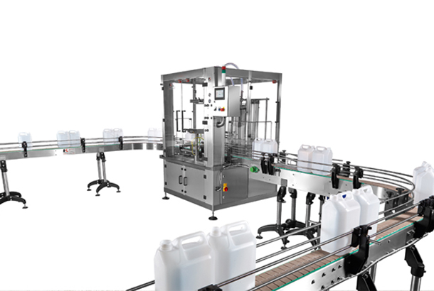 Suitable for filling detergents, liquid chemicals, and other liquids. Features fast model changeover, easy-clean cylinder, servo filling, double capping, induction sealing, labeling, and automatic checkweigher. Designed for European and American markets.