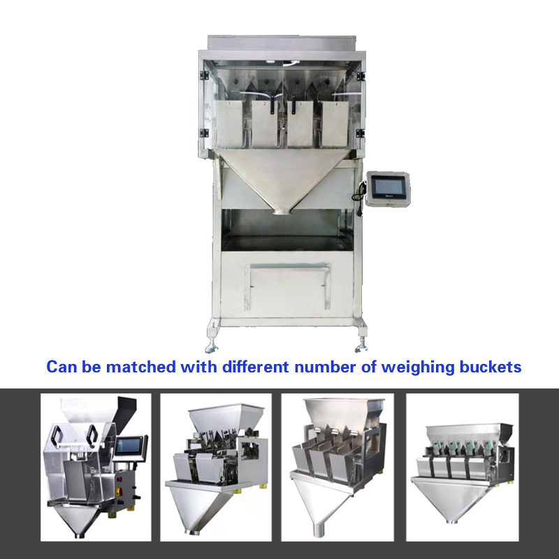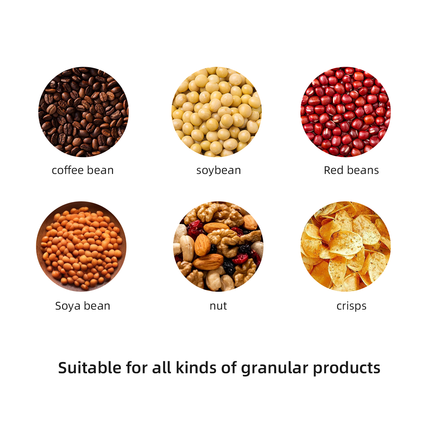 Suitable for weighing and packaging irregular lumps and granules such as peanuts, nuts, melon seeds, cashews, almonds, potato chips, puffed foods, coffee beans, rice, grains, cereals, dried fruits and vegetables, frozen foods, candies, jelly, snack foods, and small hardware.